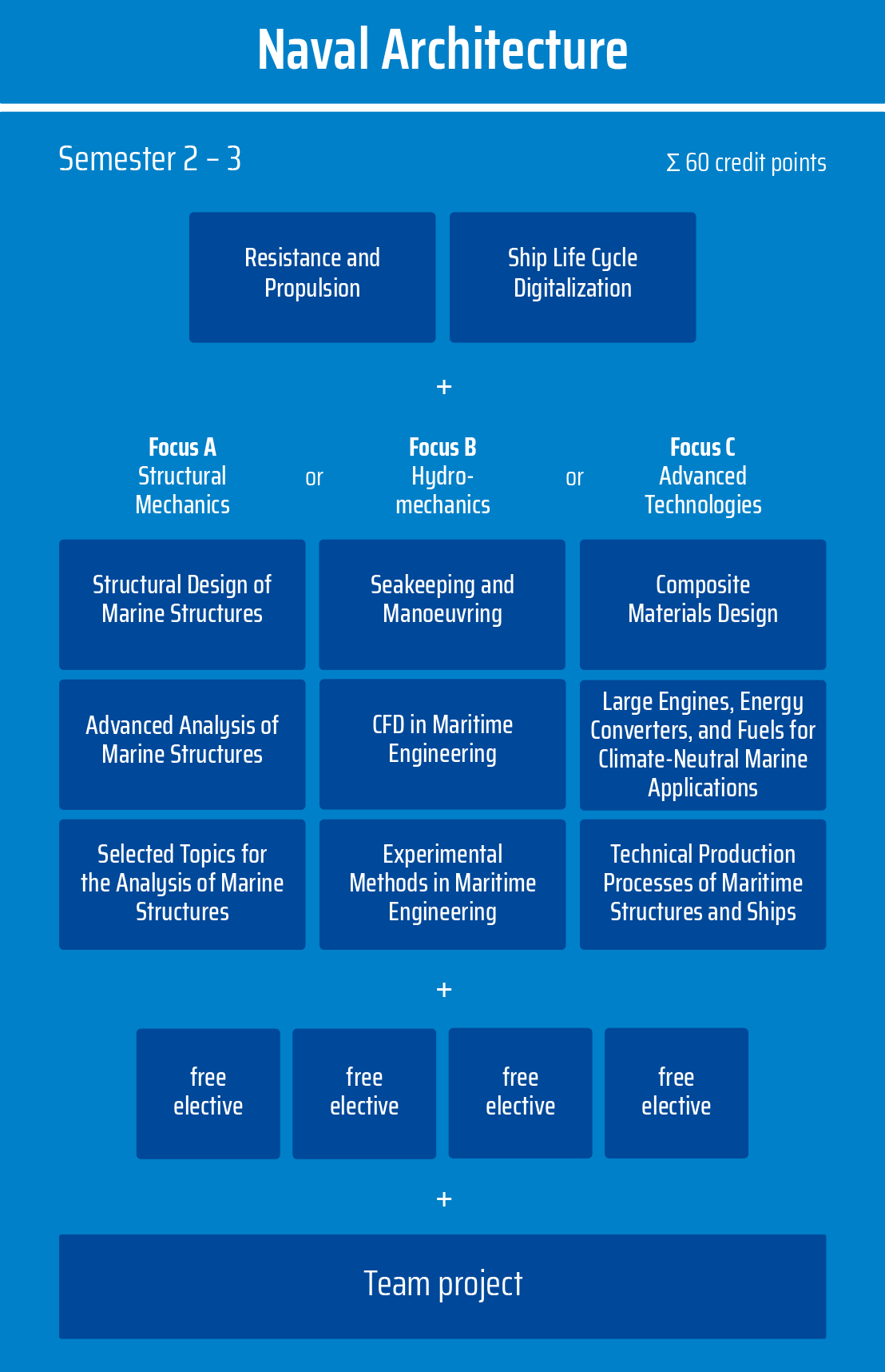 Semesters two and three offer you a wide range of options. Thus, the illustration shows examples of what your naval architecture study plan might look like: In addition to the two central compulsory elective modules of overarching importance “Resistance and Propulsion” and “Ship Life Cycle Digitalization”, three more courses are recommended if you want to specialise further in the areas of Structural Mechanics, Hydromechanics, or Advanced Technologies.