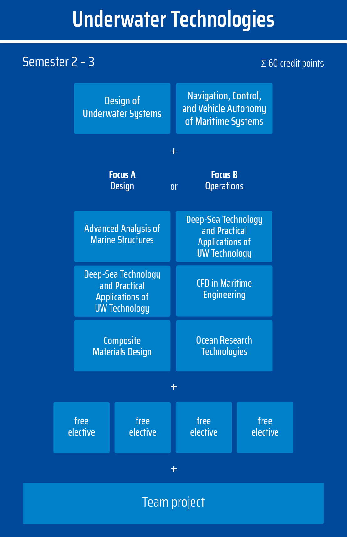 Semesters two and three offer you a wide range of options. Thus, the illustration shows examples of what your naval architecture study plan might look like: In addition to the two central compulsory elective modules of overarching importance “Design of Underwater Systems” and “Navigation, Control, and Vehicle Autonomy of Maritime Systems”, three more courses are recommended if you want to specialise further in the areas of Design or Operations.